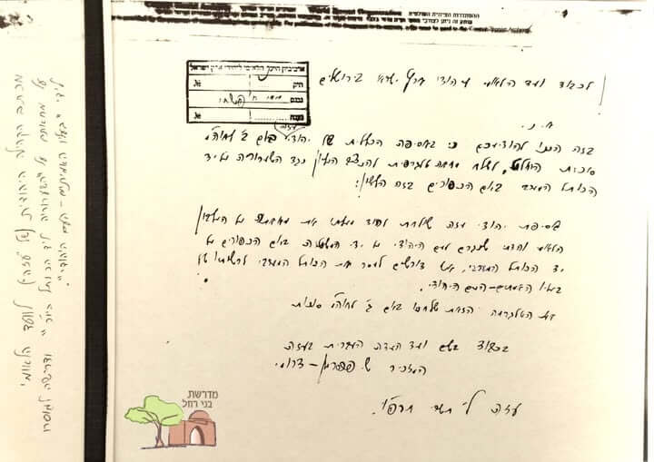 (מקור המכתב: ארכיון העיר ירושלים. באדיבות מדרשת בני רחל)